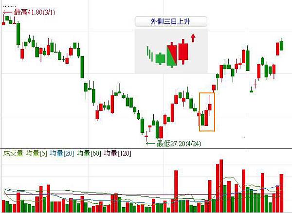 在下跌過程中若出現外側三日上升的型態,