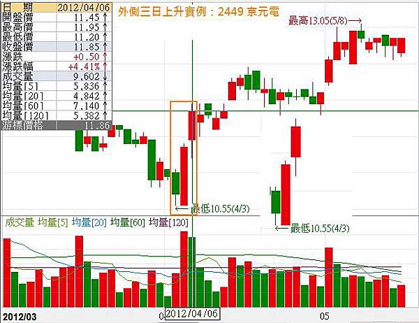 在2012/04/03~04/06出現了外側三日上升的型態